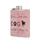 A perfect flask for those who prefer the company of dogs and the comforts of home! This flask design features text that says "I'd go...but my dog wouldn't allow it." with a paw print and dog silhouette embellishment against a pink wooden background. Additional gift items available with this design as well.