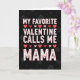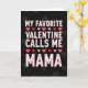 This card features the message “MY FAVORITE VALENTINE CALLS ME MAMA” centered on the front in three big lines. The letters are white with a soft pink shadow, and each one is filled with tiny flower shapes and little star-like marks in light and medium pink. Two rows of hearts run across the design, mixing deep red and pale pink hearts with a slightly textured look. The background is a deep black, with faint charcoal-gray outlines of small blossoms or snowflake-like shapes scattered behind the words. Everything is easy to read, and the message feels sweet and proud, like a quiet thank-you for being “Mama.” It’s a meaningful choice for a mom who feels loved by her little valentine, whether that’s a child or even a grown kid.