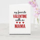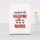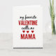 This card features a white background with the message “my favorite VALENTINE calls me MAMA” centered on the front. “my favorite” and “calls me” are written in smooth black cursive-style lettering that feels like a quick note from the heart. “VALENTINE” and “MAMA” stand out in red, all caps, with simple letter shapes that are easy to read. Just below “calls me,” three small red hearts sit in a neat row, adding a sweet touch ❤️. Along the very bottom edge, there’s a black-and-white checkerboard strip that gives the design a little extra detail without distracting from the words. It feels meaningful because it celebrates the special bond between a child and a mom, and it says “I love you” in a straightforward way 🥰. It’s a kind choice for sharing Valentine’s Day sentiments.