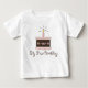A pretty chocolate birthday cake with pink frosting and icing and one lit candle that says My First Birthday in chocolate brown. A baby will look adorable in this cute 1st birthday long sleeve t shirt.