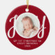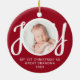 This keepsake "My First Christmas As Great Grandma" photo ornament is decorated with the word JOY in white stylish script typography on a red background. Easily customizable, with your baby's photo.