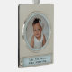 Create an adorable ornament to celebrate baby's first Christmas. The cute decoration incorporates a round photo frame for you to add a favorite photo of your little one. The photo will be shown with a pale blue surround, and the text panel underneath is pale blue with black text. Add your baby's name in elegant script typography, and the year number, to complete this delightful decoration.