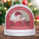 A red keepsake Christmas snow globe to celebrate your newborn baby featuring two arch photos and "My First Christmas" and their name and birth stats in elegant white serif typography.