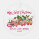 Modern Brush Script My First Christmas Baby Ornament includes Watercolor Gingerbread Train with candy, cookies and pines. Pink.