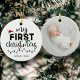 Lovely first Christmas ornament decorated with a red Santa hat, holly leaves, and colorful Christmas lights. Easily customizable with the baby's name and current year and one of your favorite pictures on the reverse.