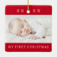 Red, ceramic ornament featuring your custom photo, the year and custom text "My first Christmas".