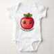 A charming baby bodysuit in a soft, pastel hue, designed to celebrate a little one's first Rosh Hashanah, features an adorable kawaii-style red apple at its center. The apple, with its round, chubby shape, shiny red skin, and a sweet smile complete with sparkling eyes and rosy cheeks, exudes pure joy. Below the image, the bodysuit showcases a customizable caption in a playful, rounded font, reading "It's my first Rosh Hashanah!"—a delightful and personal touch to commemorate this special occasion.