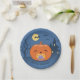 Adorable baby Halloween pumpkin with a pacifier. A dead tree, a creepy mansion, some bats, and the moon are seen on the background.