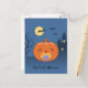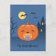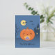 Adorable baby Halloween pumpkin with a pacifier. A dead tree, a creepy mansion, some bats, and the moon are seen on the background.