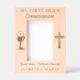 Commemorate a special milestone with this beautifully engraved wooden frame, featuring "My First Holy Communion" etched at the top, with space for the church and child's name at the bottom. A chalice with a wafer and a simple cross add meaningful detail. This customizable frame is the perfect way to preserve memories of a cherished day. Ideal as a gift or keepsake, it combines classic design with heartfelt personalization for a lasting impression. Edit text from the product page or to change font style, use the design tool.