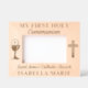 Commemorate a special milestone with this beautifully engraved wooden frame, featuring "My First Holy Communion" etched at the top, with space for the church and child's name at the bottom. A chalice with a wafer and a simple cross add meaningful detail. This customizable frame is the perfect way to preserve memories of a cherished day. Ideal as a gift or keepsake, it combines classic design with heartfelt personalization for a lasting impression. Edit text from the product page or to change font style, use the design tool.