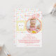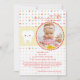 A unisex photo invitation for your baby's Agra Hadig party. The multicolored polka dots are overlaid with a yellow band featuring a tooth and a circular, scalloped, photo window. The card is easy to customize with your wording, font, font color and choice of six paper types.