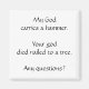 "My God carries a hammer. You god died nailed to a tree. Any questions?" Square magnet, black text on white background