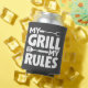 Fun barbeque graphic quote that reads: "My Grill My Rules", featuring a bbq fork and spatula. Click "Personalize" to change image and background color! | Image by Badea Mihai | Shutterstock. Image ID: 1742273987 | Shutterstock® - All Rights Reserved.