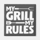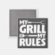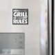 Fun barbeque graphic quote that reads: "My Grill My Rules", featuring a bbq fork and spatula. Click "Personalize" to change image and background color! | Image by Badea Mihai | Shutterstock. Image ID: 1742273987 | Shutterstock® - All Rights Reserved.