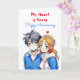 A sweet Happy Anniversary card depicting an anime boy and girl couple in blue and red. On back is a coloring page where you can personalize the names. Anniversary card for him or her.