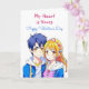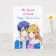 A sweet Happy Valentine's Day card depicting an anime boy and girl couple in blue and pink. On back is a coloring page where you can personalize the names. Valentine's Day card for him or her.