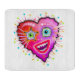 A smiling, contemporary art style emoji as a red heart shaped emoticon face in the bright, colorful Valentine colors of red, pinks, magentas and purples accented with other complementary colors.