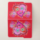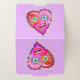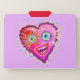 A smiling, contemporary art style emoji as a red heart shaped emoticon face in the bright, colorful Valentine colors of red, pinks, magentas and purples accented with other complementary colors.
