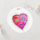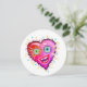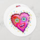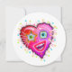 A smiling, contemporary art style emoji as a red heart shaped emoticon face in the bright, colorful Valentine colors of red, pinks, magentas and purples accented with other complementary colors.