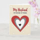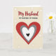 This card shows a cream-beige background with a stack of hearts centered on the front, creating a calm, loving look ❤️. At the top, the words “My Husband” appear in flowing red cursive-style lettering. Just below that, “MY PARTNER. MY FRIEND.” is written in uppercase black letters with a simple, modern look. The main heart is a large deep red shape that takes up most of the lower half of the card. Inside it sits a medium gray heart, then a smaller white heart, and finally a tiny black heart right in the middle. A few small white hearts are scattered around the background like gentle little accents. Overall, it feels romantic and steady, like a quiet promise of love and support 💘😘.
