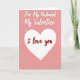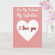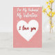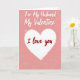 This card shows a soft pink background with a large off-white heart in the center, and everything has a slightly brushed, textured look. Near the top, the words “For My Husband My Valentine” appear in thin white cursive-style lettering. The heart has gently uneven edges, which makes it feel warm and human rather than perfect. Inside the heart, the message “I love you” is written in deep red, slanted cursive-style letters that stand out clearly. There aren’t any characters or objects, just the heart and the words, so the focus stays on love and closeness. The simple colors and calm layout make it feel sweet and steady, like a quiet promise ❤️. It’s a lovely choice for reminding your husband how much he means to you 💘.