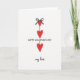 This greeting card shows three red hearts stacked in a vertical line on a soft white background. Each heart is linked to the next with a thin, hand-drawn black line, like they’re hanging in place. The top heart has a small black bow with a slightly rough, sketchy look, like it was drawn with charcoal. The hearts have a light speckled texture, which makes them feel a bit more hand-made and warm. Between the second and third hearts, the text “HAPPY VALENTINE’S DAY” appears in simple black handwritten block-style letters. Under the bottom heart, it says “my love” in a smoother black script that feels more personal. It’s a sweet, straightforward design that focuses on love and connection