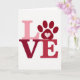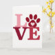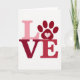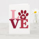 This greeting card features the word “LOVE” in large, simple letters across the center. The “L” at the top left is a soft pink, and the “O” is replaced by a deep maroon paw print. Inside the paw’s main pad, there’s a tiny light pink heart that adds a sweet, caring touch ❤️. Below, the “V” and “E” sit under the top letters and match the paw print in a dark red tone, giving the design a steady, warm look. The text is in thick block letters with smooth edges, making it easy to read and nicely balanced. The background is off-white with faint diagonal pinstripes, like a light paper texture that keeps the focus on the message 💌. It feels like a simple way to say you love someone and their furry friend, and it pairs well with a little treat like 🍫. Hope it helps you share kind Valentine’s Day feelings with someone you care about.