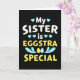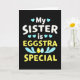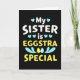 This card features a stacked message on a deep black background, arranged to feel close and affectionate like a note meant for a beloved sibling 🌷. Near the top, the small words “My” and “is” appear in soft white, each tucked beside a tiny light blue heart for a gentle, caring touch. Centered between them, “SISTER” stands out in large white letters sprinkled with faint golden-yellow specks, like a light dusting of stars. Below that, “EGGSTRA” is set in bright yellow with the same speckled texture, giving it a sunny, celebratory look 🐰. In the middle of this line, two oval shapes sit side by side, cradled by curved light blue forms that resemble soft leaves or bunny ears, adding a sweet, friendly mood. One oval is yellow with a small white cross, and the other is light blue with a white asterisk, creating a simple pair that feels like two friends matching. At the bottom, “SPECIAL” appears in the same bright speckled yellow, centered and evenly spaced under the other lines, with the light blue accents framing the ovals just above it.