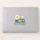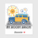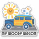 This design features a classic wood-paneled station wagon cruising down an open road, evoking memories of family road trips, beach vacations, and the spirit of adventure.
