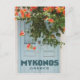 Mykonos, Greece blue door photo with flowers hanging in front and the name Mykonos Greece at the bottom. Celebrating the beauty of the Greek Island of Mykonos.
