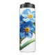This travel mug is made of stainless steel with a black handle and a pattern of blue flowers. The flowers are stylized and abstract, with a simple but elegant design. The mug has a capacity of 16 ounces (473ml) and features vacuum insulation to keep drinks hot for extended periods of time. The mug also has a leak-proof lid for convenient use on the go.