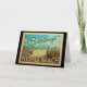 This Greetings From Myrtle Beach vintage postcard design features a sandy beach with a beautiful turquoise ocean water and above the sea, a blue sky with billowy white clouds. In vintage travels style.