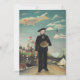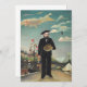 Myself Portrait Landscape (1890) by Henri Rousseau is a vintage post impressionism fine art self portrait painting. Rousseau is a giant, standing on the banks of the Seine River in Paris France with boats covered with international flags from around the world. The artist standing with a palette of paints, a painters brush and wearing a hat. A beautiful sunny summer day with blue skies with dirigibles and hot air balloons floating near the clouds. A bridge and buildings are in the background.