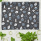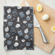 Get ready for Halloween with this spooky chic kitchen towel featuring a pattern of snakes, spellbooks, candles, jars, skulls, tarot cards, and potions on a charcoal background.