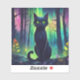 Step into the enchanting world of 'Whispering Woods', where the mystical aurora borealis dances across the night sky. Amidst the ancient trees, a majestic black cat with piercing bright green eyes sits regally, basking in the ethereal glow. This stunning illustration, crafted with the assistance of artificial intelligence, invites you to get lost in the magic of the forest.