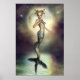 A blond mermaid with a shimmering tail of green and yellow is in front of a full moon on a mystical background above the ocean water. Enjoy!