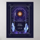 Mystic Sun Event Poster featuring a mystical design inspired by astrology, esoteric, occult, and mysterious elements. This design has hues of blue, purple, and orange, a starry background, crystals, constellations, a sun with a face and moon phases. Design can be customized for all types of events including Bridal Showers, Weddings, Birthdays, Engagements, Anniversaries, Bachelorette Party, Graduation, Baby Showers, Retirement, House Warming and other Parties. Includes a template for personal customization.
