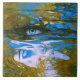 Mystic Waters: An eye appears in the midst of a gold and blue swirling sea, with a subtle reflection of a face in the water. This surreal image conveys the idea of exploring the depths of our psyche and the duality of perception and reality, where dreams and consciousness intertwine.