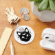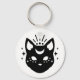 A sleek and enchanting keychain design features the mystical face of a black cat in bold black with white features. The cat's eyes are large and mesmerizing, exuding an air of mystery. Above its head, a triple moon symbol, with the waxing, full, and waning moons, adds a touch of mystical charm. The simplicity of the design, with its stark contrast, makes it both elegant and captivating, perfect for those who love witchy, magical aesthetics.
