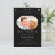 Mystical Black Silver Sun Moon Star Space Wedding Save The Dates features a silver sun, moon and stars frame on a black background. Inside is your favorite photo and your custom save the date information. Personalize by editing the text in the text boxes. Designed for you by ©2022 Evco Studio www.zazzle.com/store/evcostudio