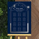 Mystical Blue Silver Sun Moon Stars Astronomy Celestial Cosmic Galaxy Space Wedding Seating Chart features a silver sun, moon and stars frame on a blue background. Inside the frame is the text "Welcome" in elegant silver calligraphy script and your custom wedding reception seating chart information. Designed for you by ©2022 Evco Studio www.zazzle.com/store/evcostudio