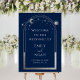 Mystical Blue Silver Sun Moon Stars Astronomy Celestial Cosmic Galaxy Space Wedding Welcome Sign features a silver sun, moon and stars frame on a plum background. Inside the frame is your custom text in elegant gold calligraphy script. Designed for you by ©2022 Evco Studio www.zazzle.com/store/evcostudio
