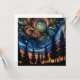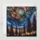 Mystical ai art with a swirling blue and orange sky with silhouettes of pine trees.