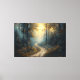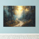A serene and mysterious forest path winds through dense woods, bathed in soft golden light breaking through the morning mist. The atmosphere is calm and enchanting, with a blend of deep shadows and glowing highlights illuminating the foliage. The scene invites quiet contemplation and a sense of adventure.