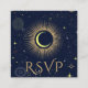 Celestial mystical personalized QR code wedding response enclosure card featuring galaxy milky way midnight sky with star dust, crescent moon and other astrological symbols in navy blue and golden colors. This card is easily editable. If you need help with the customization of this card or you need more matching products for this collection kindly message me via Zazzle.