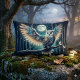 A luminous night scene captures a majestic owl perched beneath a glowing full moon, wings outstretched in a moment of quiet power. Intricate feather patterns blend folk-inspired detail with celestial motifs, creating a magical balance between nature and fantasy. Deep navy skies, soft teal highlights, and warm golden accents weave together to form an enchanting, dreamlike atmosphere. Subtle forest silhouettes fade into the background, adding depth and mystery, while tiny star-like lights shimmer throughout the scene. This artwork evokes a sense of wisdom, stillness, and wonder, perfect for those drawn to mystical woodland energy and celestial beauty. AI generated artwork.