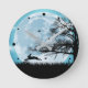 Image of a large blue full moon with clouds and stars in the background. In the foreground, the silhouettes of grass, a tree, butterflies, and a leaping rabbit.