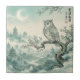 Traditional East Asian inspired artwork ceramic tile featuring a detailed owl perched on a flowering branch above a misty valley with pagodas, bridges, butterflies, and a glowing crescent moon. Ideal for owl lovers, fantasy art fans, nature enthusiasts, and anyone who loves serene Asian inspired aesthetics.