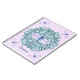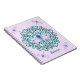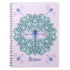 Beautiful mystical personalized mandala dragonfly notebook. Features an ice blue mandala with four purple and blue watercolor dragonflies on the outsides and a large dragonfly on top of the center of the mandala. Pink background. Personalized with your name in a fun modern script font.